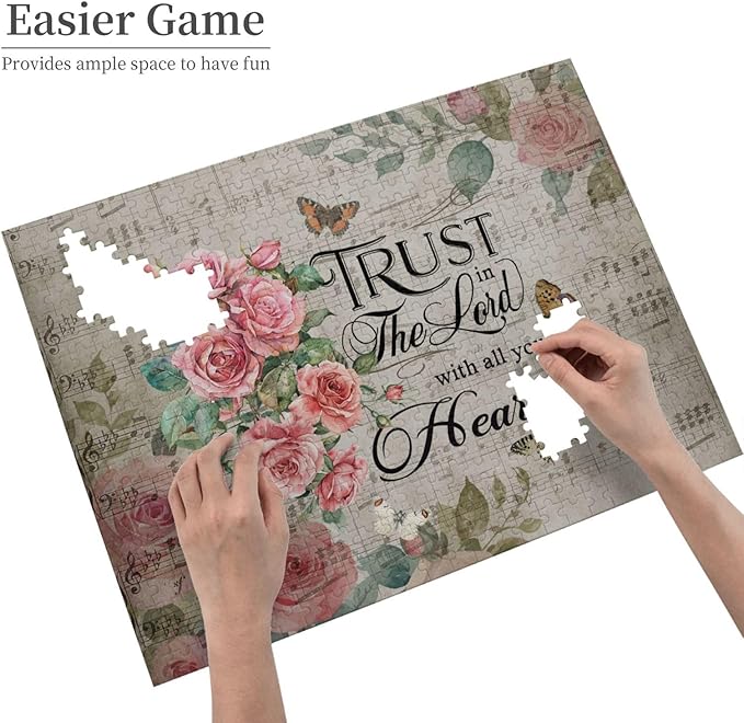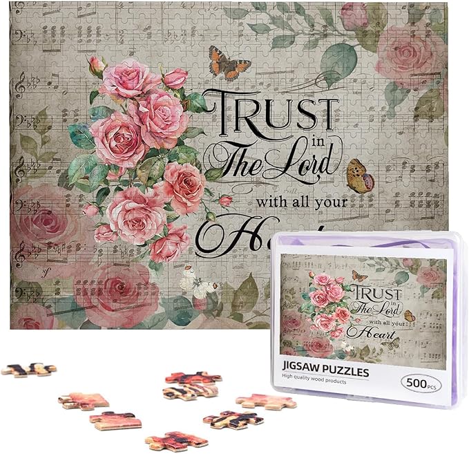 Christian Jigsaw Puzzles 500 Pieces for Adults, Trust in The Lord Bible Quote with Roses & Sheet Music, Religious Wooden Puzzle for Stress Relief, Faith-Based Gift & Wall Decor