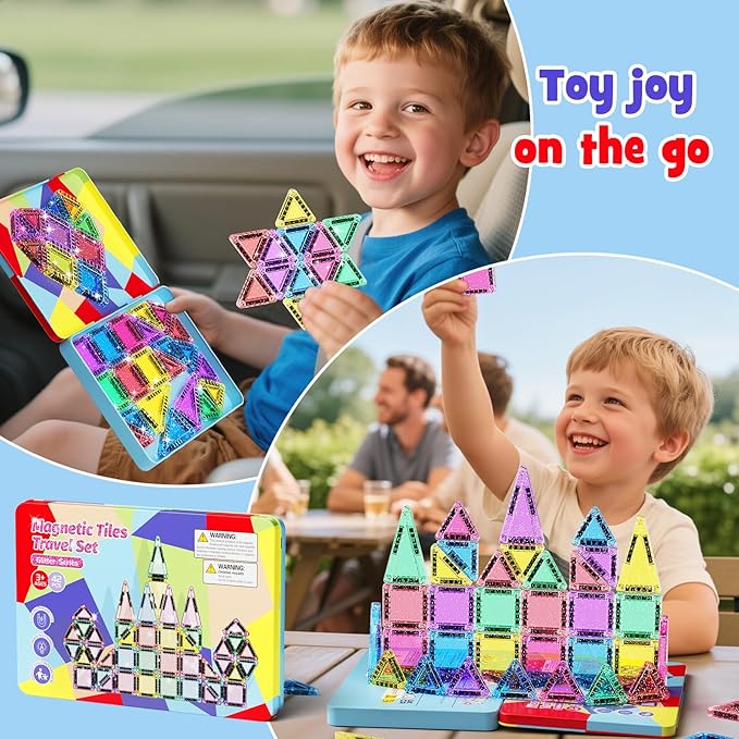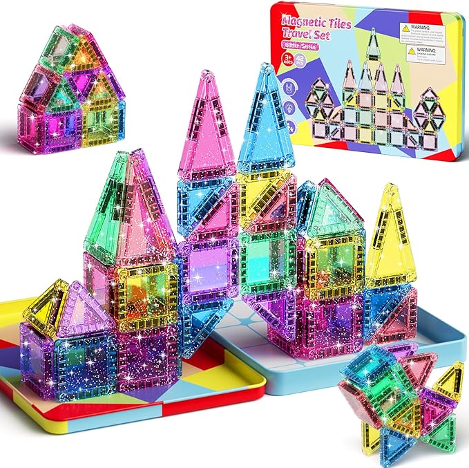Travel Mini Magnetic Tiles Glitter Construction Set 42Pcs,Magnetic Building Blocks Stem Gift Travel Toys for Kids for Boys and Girls Ages 3+