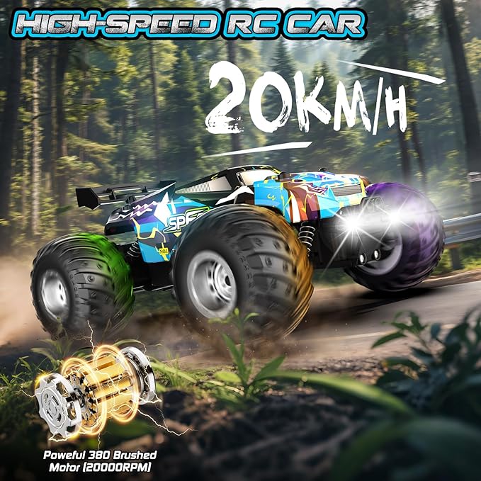 Remote Control Car, 1:18 2WD Off-Road RC Truck 20 KM/H, All-Terrain RC Cars with Headlights, BodyLights, 2.4GH Rechargeable Remote Control Monster Truck, Christmas or Birthday Gift Toys for Boys Girls