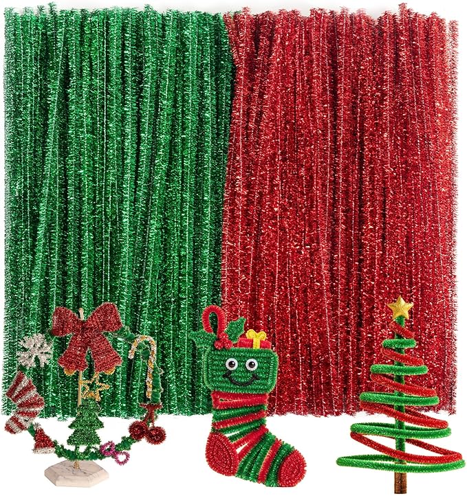 Caydo 200 Pieces Glitter Red & Green Pipe Cleaners, Thick Fluffy Chenille Stems, Pipe Cleaner Crafts for Arts & Crafts, Perfect for Making Animals, Flowers, and Valentine's Day Decorations
