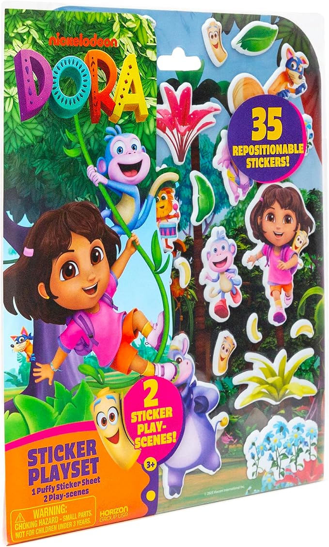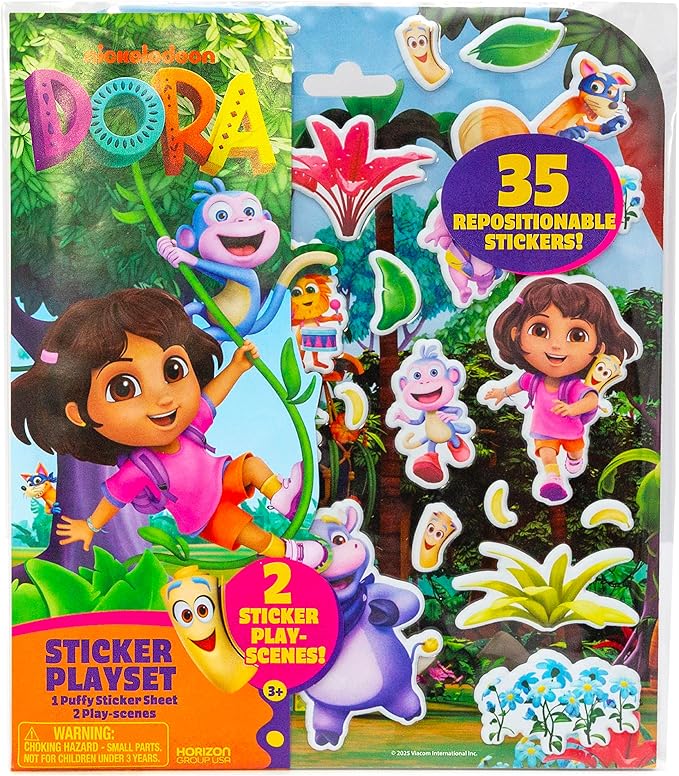 Dora Puffy Sticker Playset, 35 Reusable Stickers and 2 Play Scenes, Fun Kids Activities, Toddler Toys, Road Trip Essentials, Gifts for 4 Year Old Girl, Mess Free Airplane Toy for Little Ones