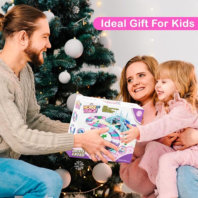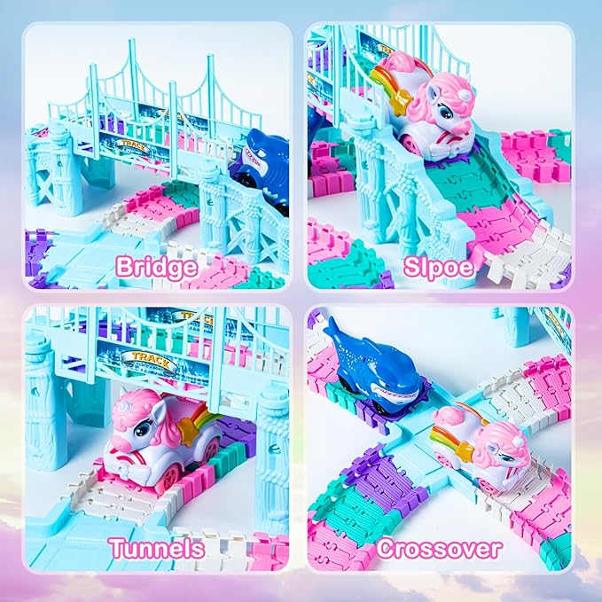 Unicorn Race Track Car Set for Kids, Flexible DIY Tracks with Unicorn and Shark Cars, STEM Building Toy for Girls and Boys Ages 3 4 5 6 7, Birthday Gift Idea
