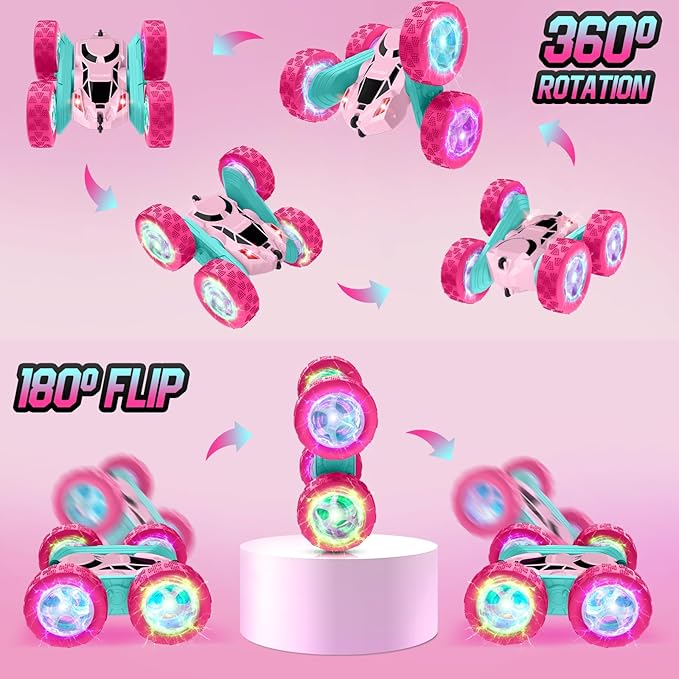 Pink Remote Control Car for Girls,Double Sided 360°Flip, with Headlights, Girl Princess Toys Rechargeable Toy Car for 6-7 6-8 9 10-12 Year Old Girls Birthday