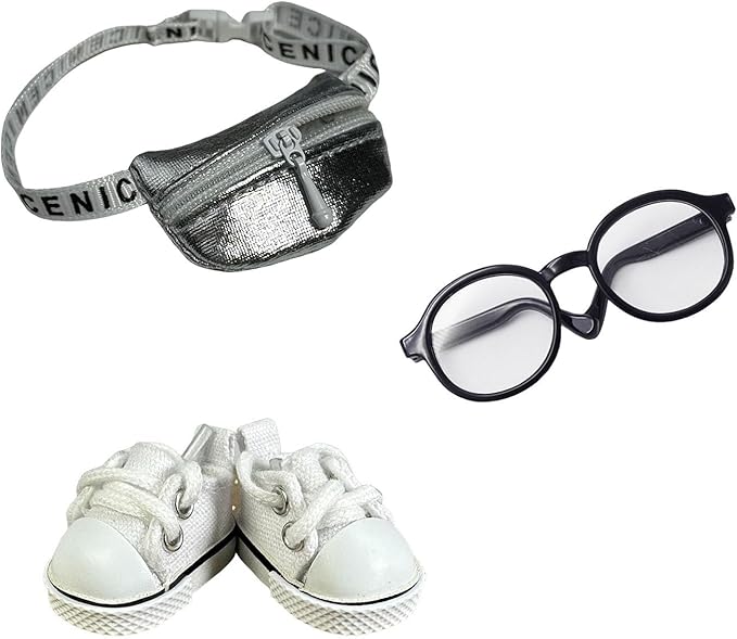 3pcs Doll Accessories Set Included Mini Glasses, Shoulder Bag and Canvas Shoes, Dress Up Accessories Replacement for 17cm Doll, Mini Costume Supplies for 6.7in Figures (Set of Sliver)