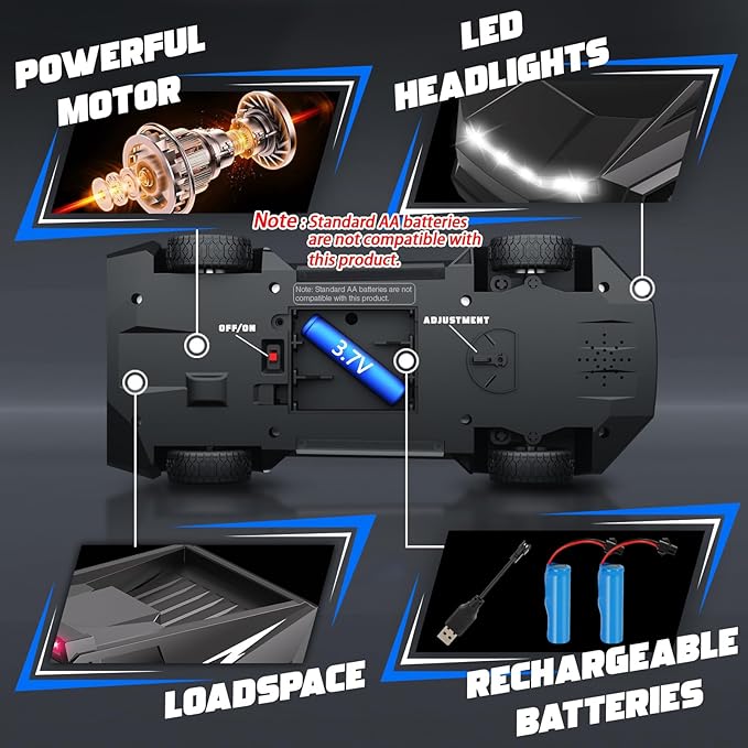 About This 🚓REMOTE CONTROL CAR TOYS: You will receive 1*Remote Control Car,2*Rechargeable Batteries,1*Remote Control,1*USB Charging Cable,1*Screwdriver,1*Instruction Manual. This unique remote... Read more