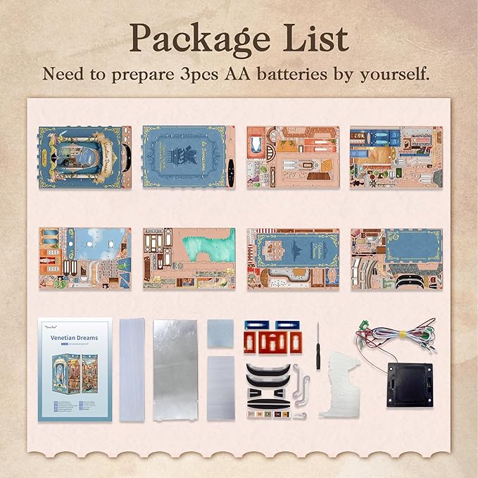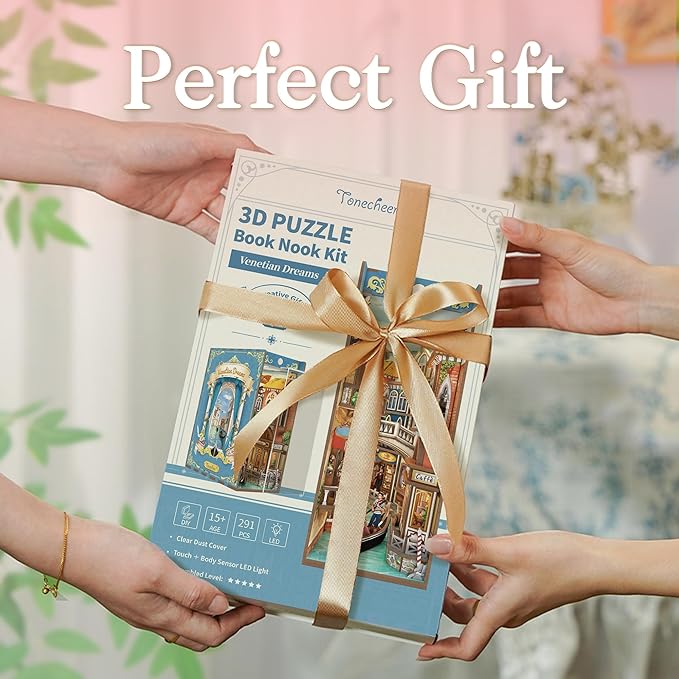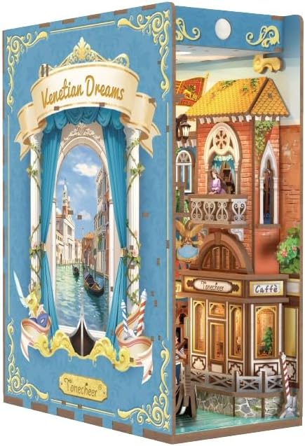 Tonecheer DIY Book Nook Kit for Adults, 3D Wooden Puzzle Bookend Miniature House Kit, Booknook Bookshelf Insert Decor with Dust Cover and LED Lights Gifts (Venetian Dreams)