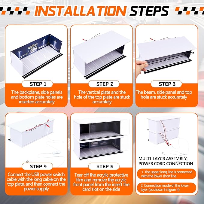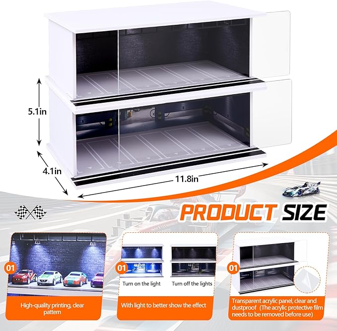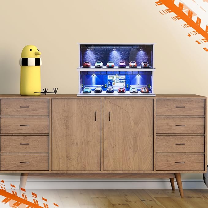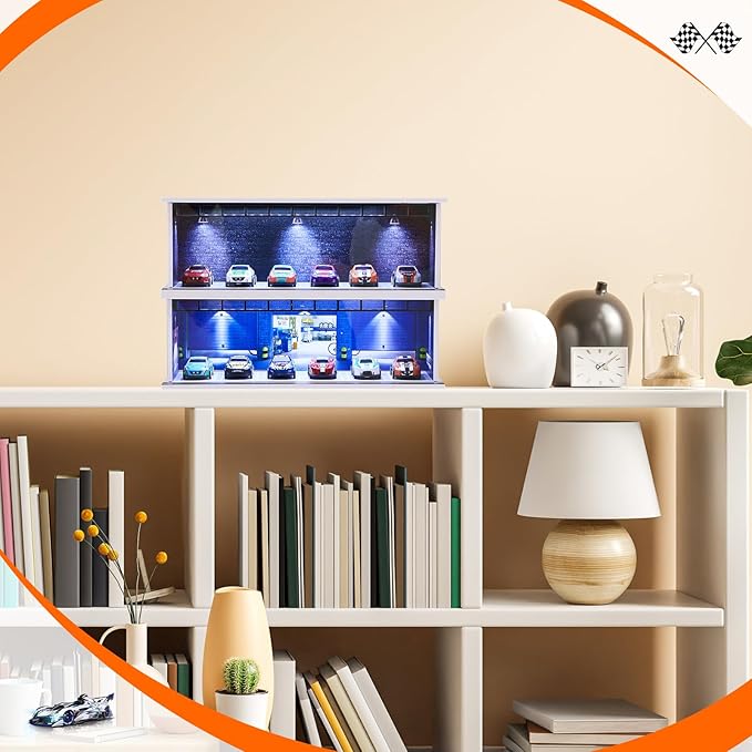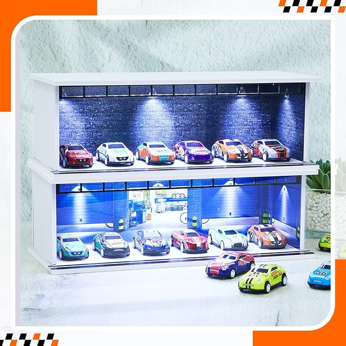 2 Pcs Display Case for Toy Car Garage with LED Light Stackable 1/64 Scale Diecast Toy Cars Garage for Maximum 58 Model Car Display and Storage(Depot)