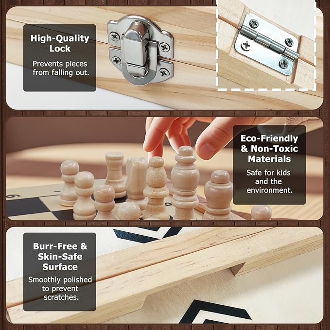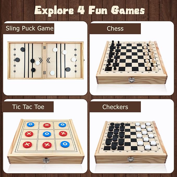 About This 4-IN-1 WOODEN BOARD GAME SET: Including Chess, Checkers Game, Tic Tac Toe & Sling Puck Game in a... Read more