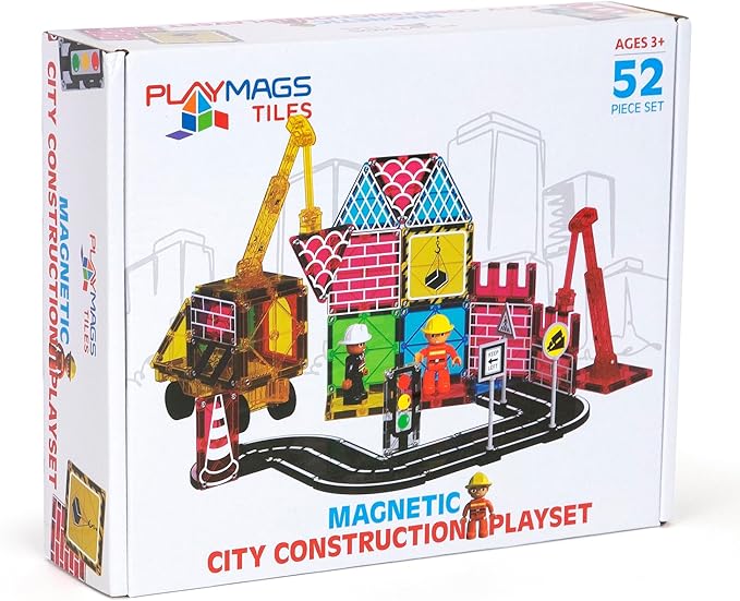 Playmags City Construction Magnetic Tiles Set, Building Blocks with Crane & Road Pieces, Educational STEM Toys for Boys & Girls Ages 3+ 52-Piece