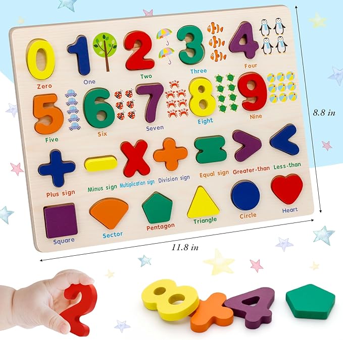 Number Puzzle Wooden Puzzles for Toddlers 3 4 5 Year Old, Shape Learning Puzzles Toddler Toys with Puzzle Board & Letter Blocks, Preschool Educational for Girls Boys, Pattern Number