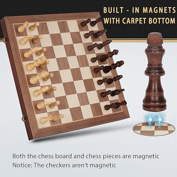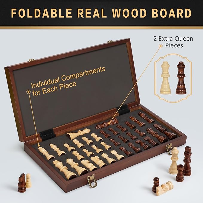 Magnetic Wooden Chess Set, 15" Folding Chess Board with 2 Extra Queens, Portable Travel Chess Set with Pieces Storage Slots, Beginner Chess Board Game for Adults & Kids