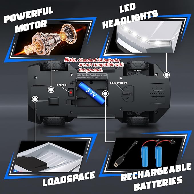 About This 🚓REMOTE CONTROL CAR TOYS: You will receive 1*Remote Control Car,2*Rechargeable Batteries,1*Remote Control,1*USB Charging Cable,1*Screwdriver,1*Instruction Manual. This unique remote... Read more