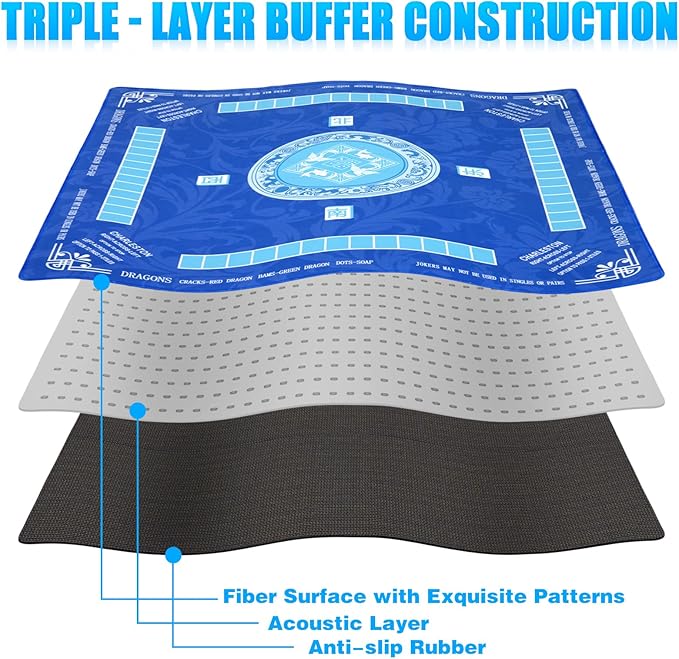 Mahjong Mat with Carrying Bag for Table 32x32 Inch – Non-Slip Noise-Reducing Rubber Mat with Rules for Mahjong, Poker, Card Games, Board Games & Dominoes (Blue)