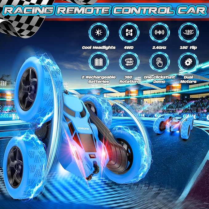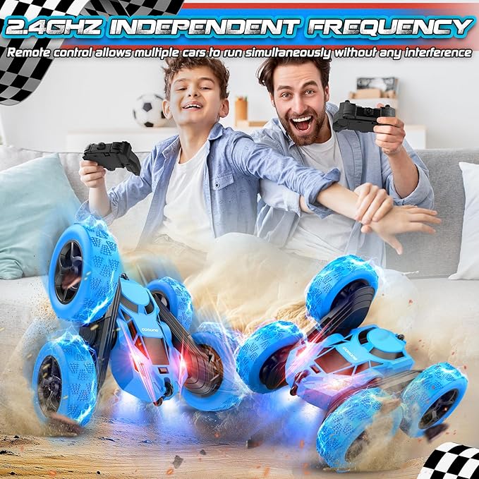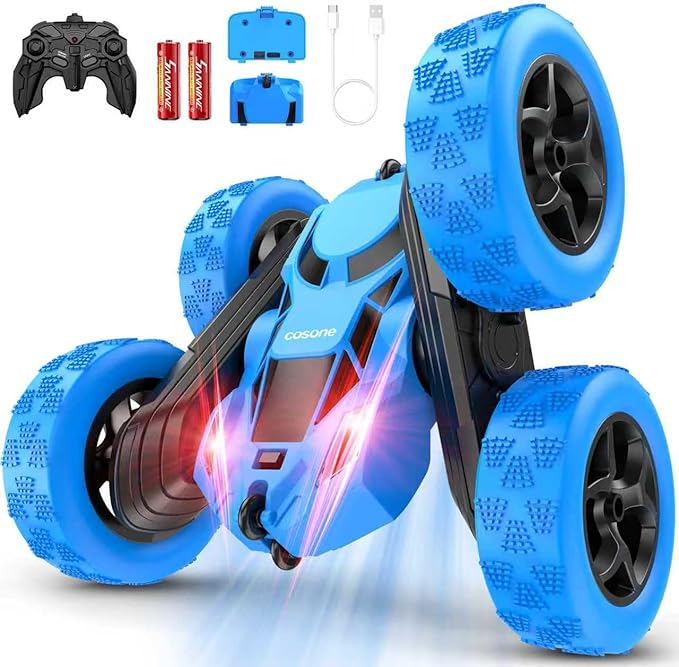 Remote Control Car, RC Cars Toys for Kids Ages 6-12, 4WD Stunt Car with LED Lights & 360° Flips, 2.4GHz, Upgraded USB-C Modular Batteries, 6-10 Year Old Boys Birthday Gift - Blue