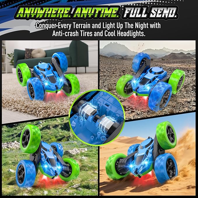 Upgraded RC Car for Kids, 360° Rotating Double Sided Stunt Vehicle with Headlights, 2.4GHz 4WD Remote Control Car, USB-C Rechargeable Electric Toy for Boys & Girls (Blue-Green)