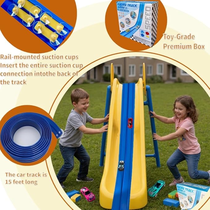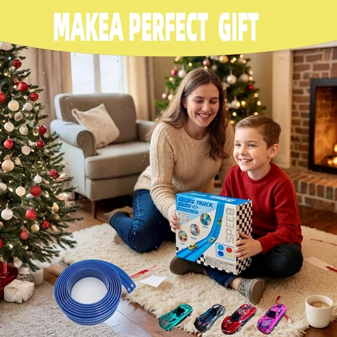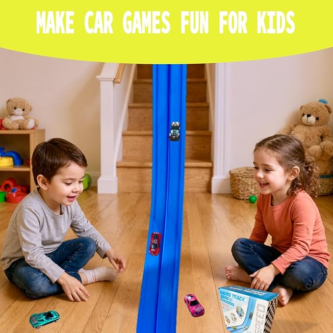 Flex Track 15 Ft Starter Set - Flexible Race Car Ramp Track for Kids Ages 3-8 with 4 Cars & 12 Suction Cups, Compatible with Hot Wheels & 1/64th Diecast Cars, Portable Blue Racetrack Toy