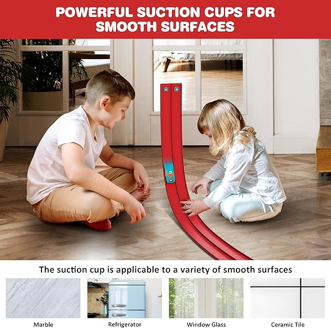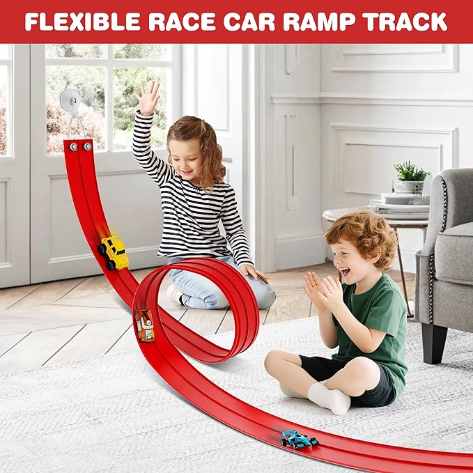 16 Ft Flexible Race Car Ramp Track for Kids Toy with Suction Cups, Compatible with Diecast 1/64th Cars, Rolls Up Portable Racetrack Party Favor Gifts for Boys Ages 3-10 Year Old (Racing Red)