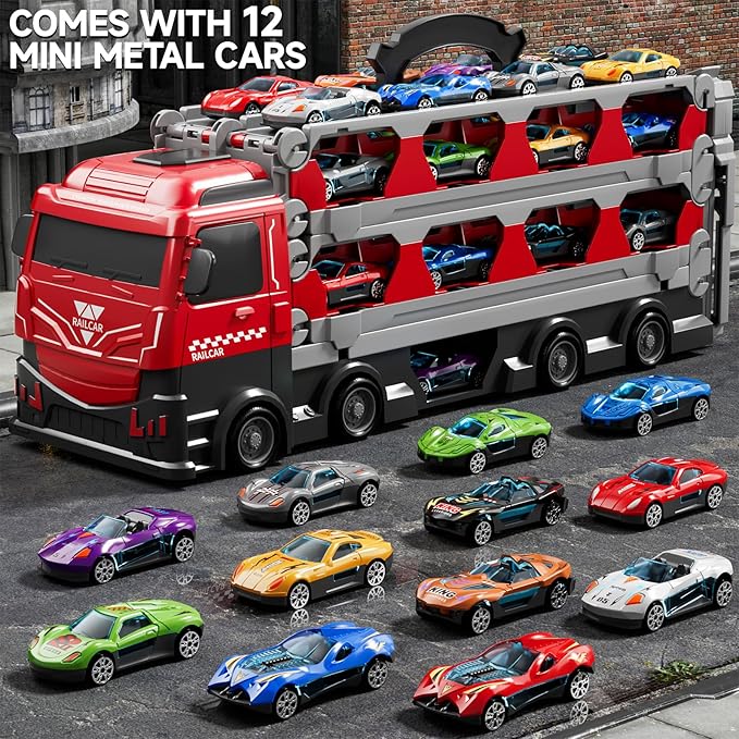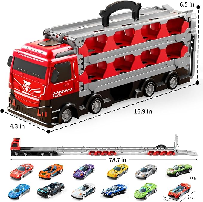 Toy Truck for 3 4 5 6 Years Old Kids Boys | 78-Inch Race Track Transport Vehicle & 12 Die-Cast Metal Toy Cars | Toddler Truck Car Toys Set Gifts for Age 3-12 Years Old Kids Boy