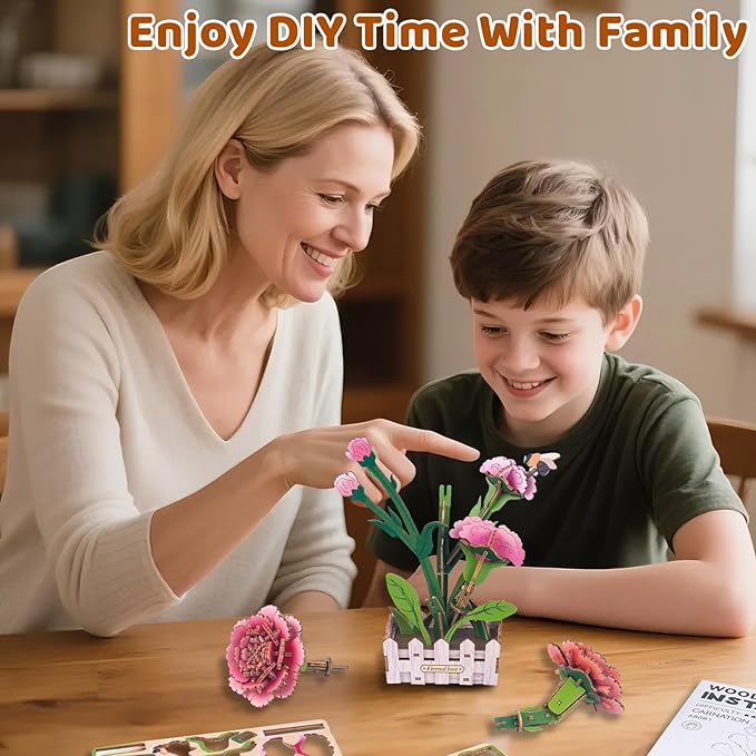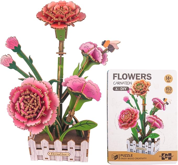 3D Wooden Flower Puzzles for Adults Carnation, DIY Artificial Flower Building Set Wooden Bloom Craft Kits Home Decoration, for Women Mom Birthday Thanksgiving Christmas Valentine's Day
