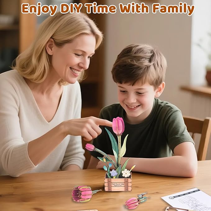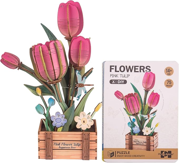 3D Wooden Flower Puzzles for Adults Pink Tulip, DIY Artificial Flower Building Set Wooden Bloom Craft Kits Home Decoration, for Women Mom Birthday Thanksgiving Christmas Valentine's Day
