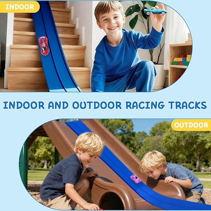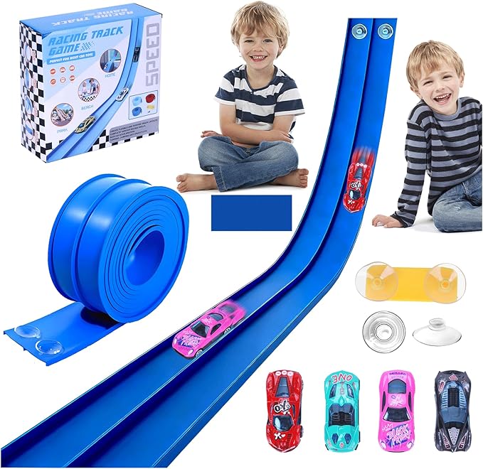 Flexible Race Car Ramp Track for Kids Toy 4 Small Race Cars and 8 Suction Cups Compatible with Hot Wheels and Diecast 1/64th Cars, Rolls Up Portable Racetrack for Ages 3 & Up (Dark Blue)