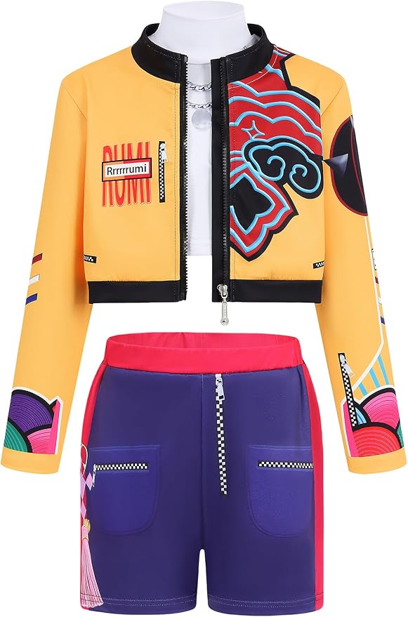 • The Complete 3-Piece Pop Singer Star Costume: Achieve a professional, truly layered look with this deluxe 3-piece star performer rumi costume set, including a separate cropped bomber jacket, a sleeveless turtleneck crop top, and stylish athletic shorts