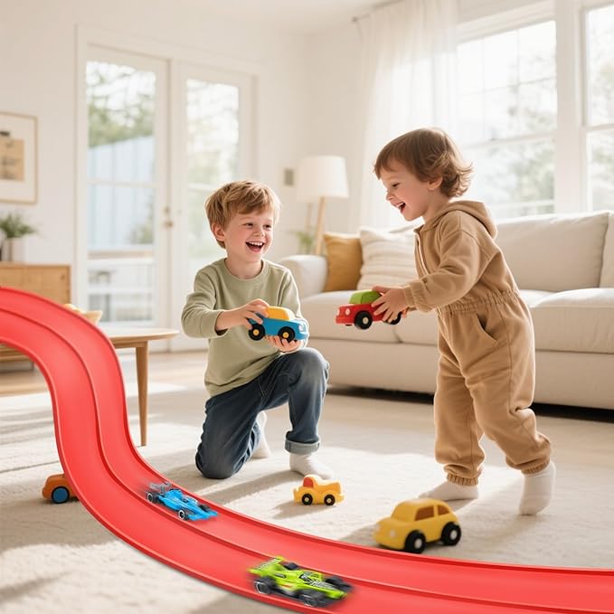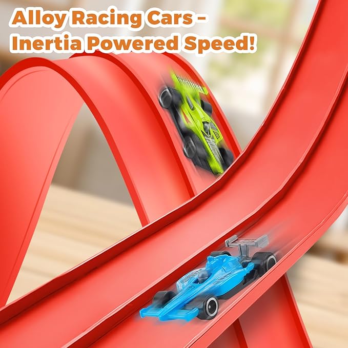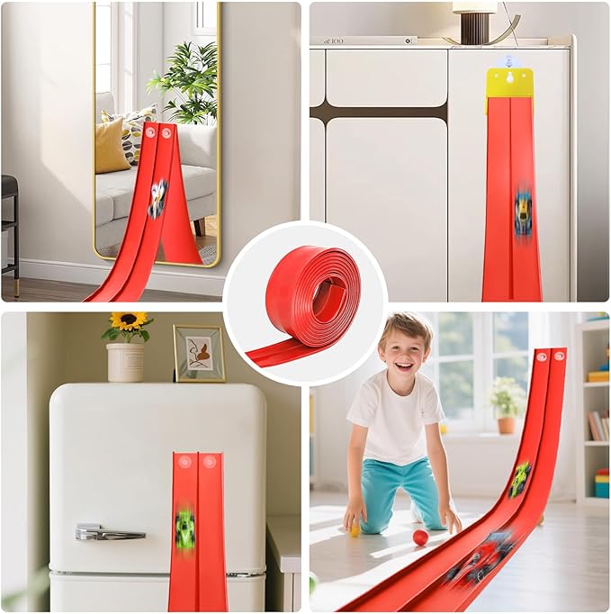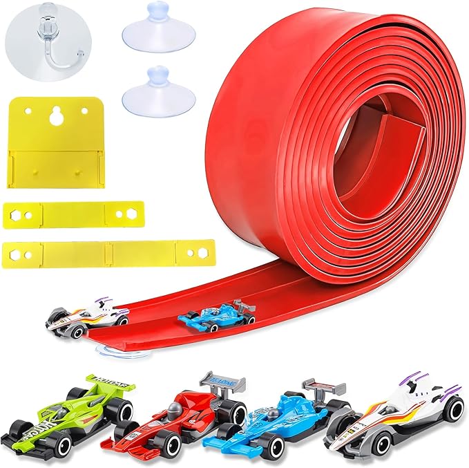 15 Ft Flexible Race Car Track, Portable Dual-Sided Race Car Track with 4 Cars & Suction Cups, Compatible with Hot Wheels & 1/64 Diecast Cars, Kids’ Car Ramp & Race Track (red)