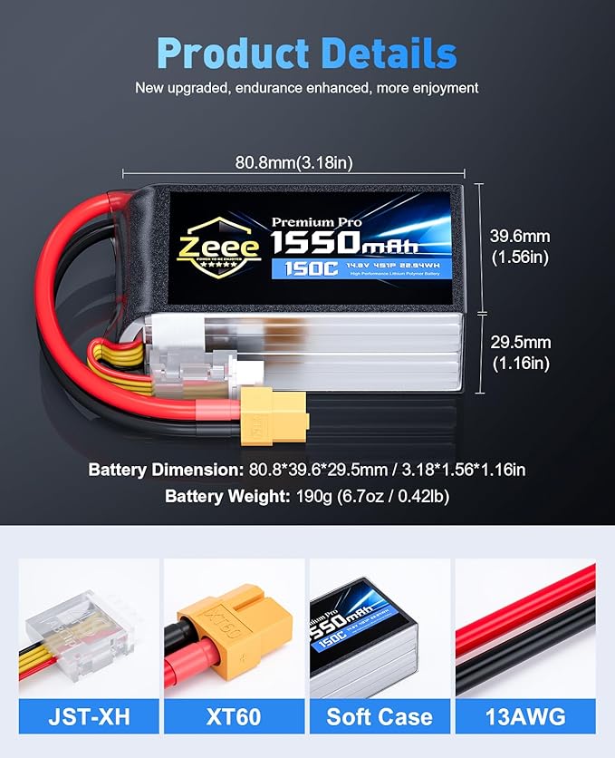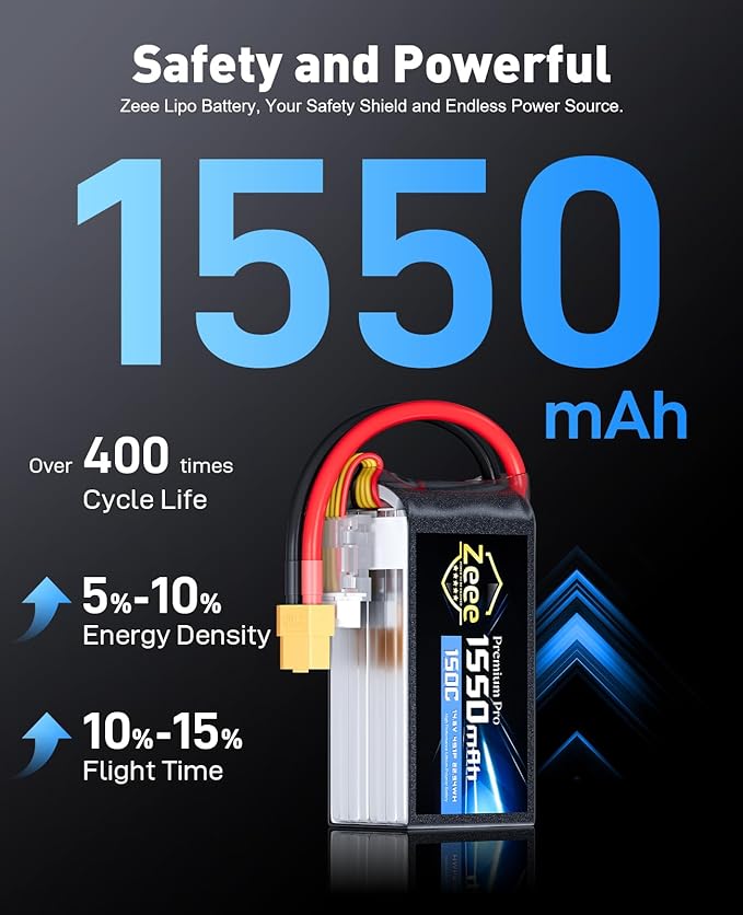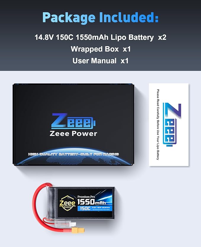 Zeee Premium Pro 1550mAh 4S Lipo Battery 14.8V 150C Ultra-Low IR Soft Pack RC Battery with XT60 Plug for FPV Drone Quadcopter Racing Helicopter Airplane RC Boat RC Car RC Models(2 Pack)