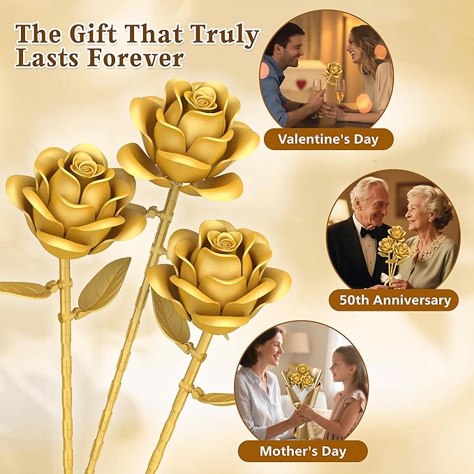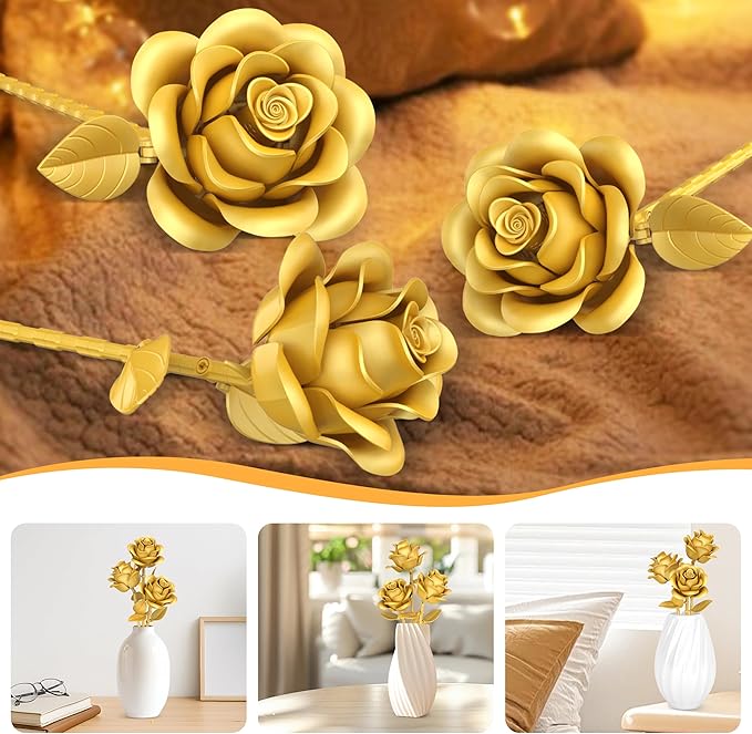 Gold Roses Flower Building Set - 3 Roses Bouquet Botanical Building Blocks for Adult, Home Decor Romantic Anniversary Valentine's Day Gift for Her, Wife, Girlfriend, Mom