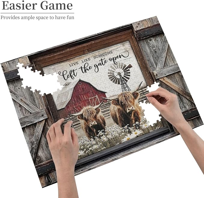 Highland Cow Jigsaw Puzzles 500 Pieces for Adults, Farm Animal & Daisies Country Scene, Rustic Window View Wooden Puzzle, Relaxing Nature Art & Farmhouse Decor Gift