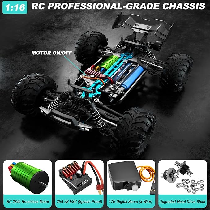1:16 Scale RC Car for Adults, 45+ MPH High Speed 4WD Brushless Electric Truck - 4x4 Waterproof Off-Road Remote Control Vehicle with 2 Rechargeable Batteries & 2.4GHz Remote