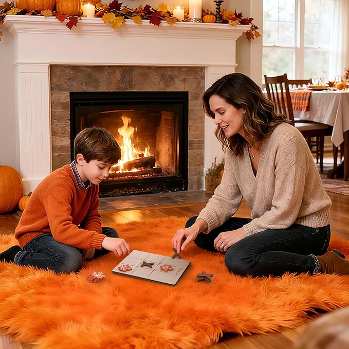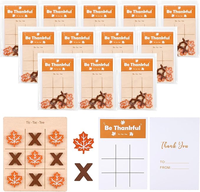 12 Pcs Fall Tic Tac Toe Game, Mini Wooden Tic Tac Toe Strategic Board Game with Maple Leaf, Brown X Pieces, Thanksgiving Cards Included, Ideal for Fall Holiday Party Favor Family Activities