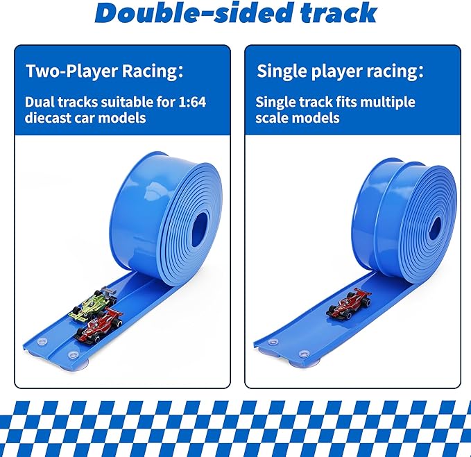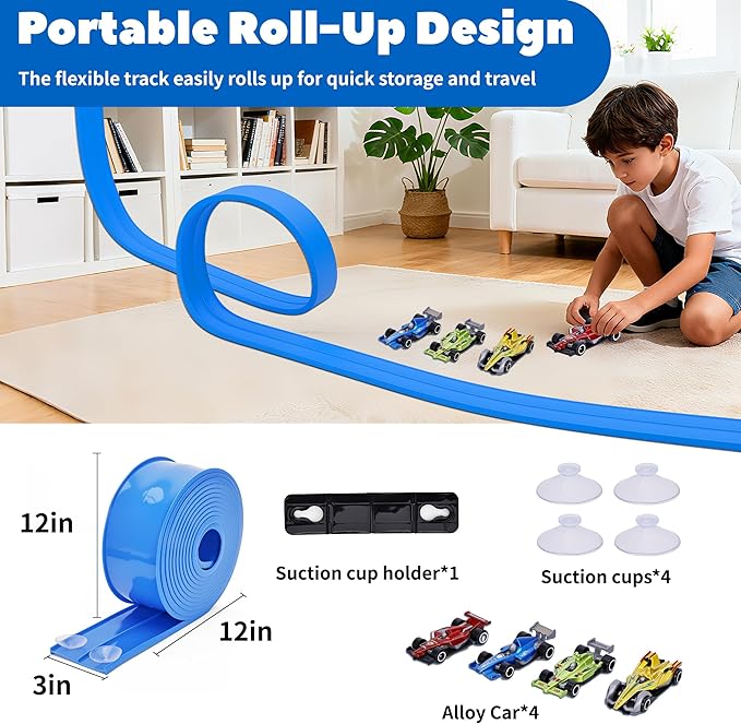 15 Ft Flexible Race Car Track for Kids, Double-Sided Racetrack with Suction Cups, Compatible with Hot Wheels & 1:64 Diecast Cars,Portable Roll Up Track Toy,Gift for Boys Girls Ages 3+ (Blue)