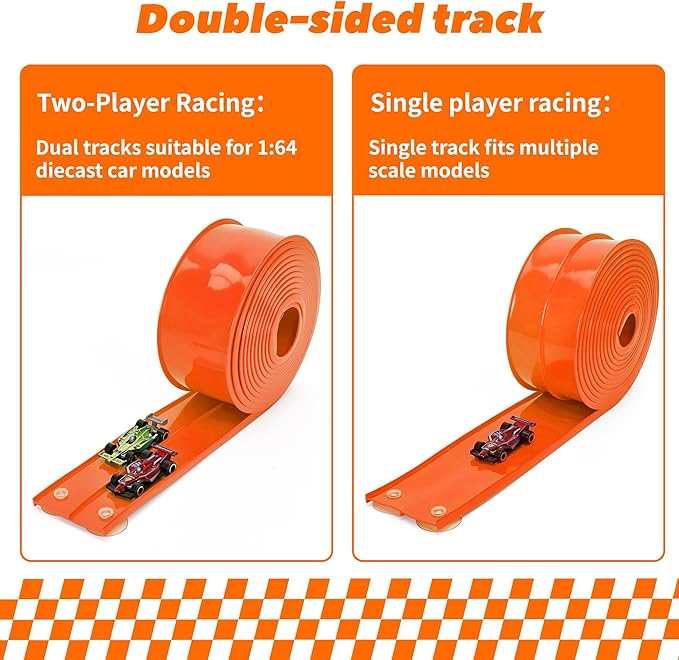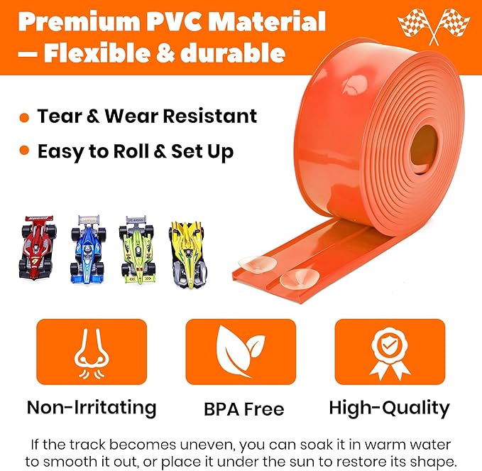 15 Ft Flexible Race Car Track for Kids, Double-Sided Racetrack with Suction Cups, Compatible with Hot Wheels & 1:64 Diecast Cars,Portable Roll Up Track Toy,Gift for Boys Girls Ages 3+ (Orange)