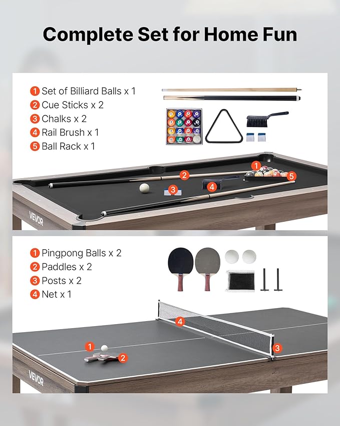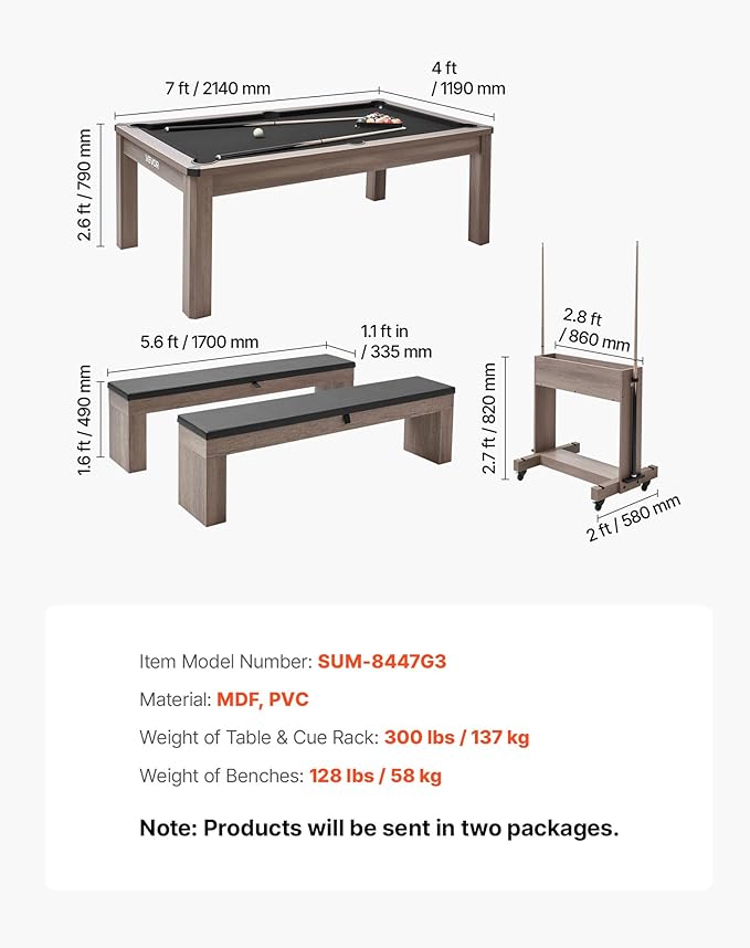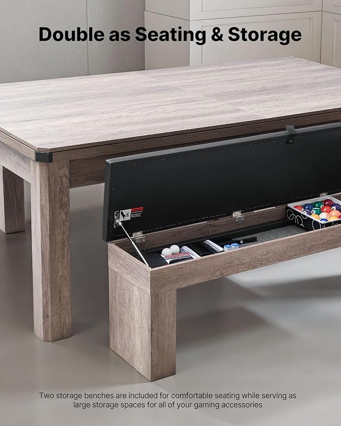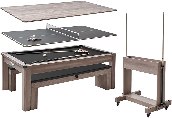 VEVOR 7ft Pool Table Combo Set, 3-in-1 Multi Game Billiards Tables with Dining Top and Ping Pong, 2 Benches for Storage and Accessories, Includes Ball Cue Rack Chalk Brush, for Family Recreation Room