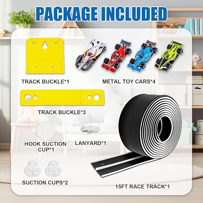 Flexible Race Track Toys for Kids, 15 Ft Double Lane Racetrack with 4 Cars & Suction Cups, Compatible with Hot Wheels & 1/64 Diecast Cars, Portable Roll Up Car Ramp Track Set for Ages 3+(White&Black)