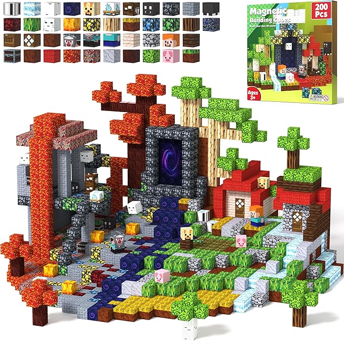 Magnetic Blocks 200 PCS Magnet Building Blocks Cubes Sensory Toys for 3-12 Years Old Gamer Player Kids, Stacking Magnets Birthday Christmas Graduation Gift Set, 0.8 Inch Block, Nether and Overworld