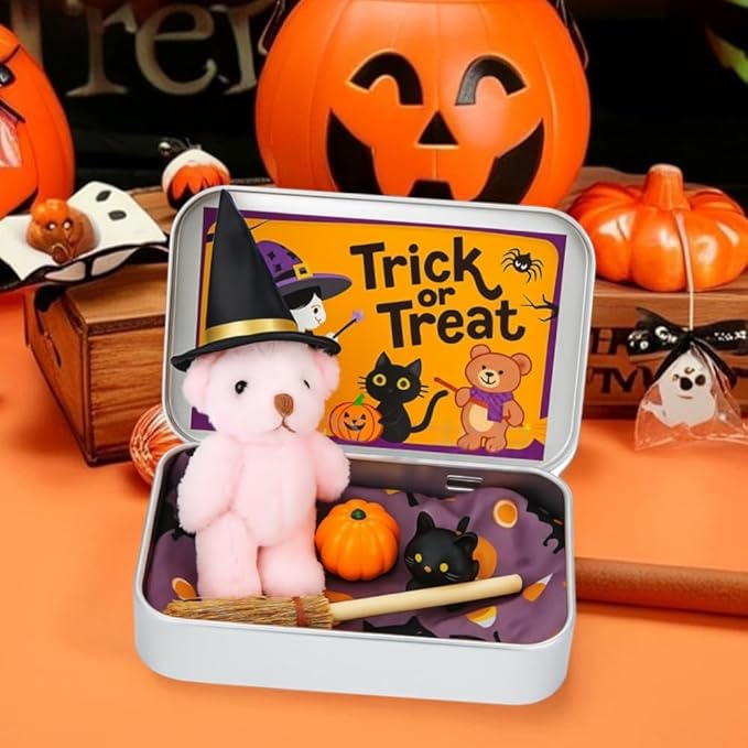 Halloween Bear in a Box for Trick or Treat, Miniature Witcher, Halloween Animal Pocket Hug Surprise Box, Cute Bear in Box with Pumpkin and cat Decorations (Light Brown)