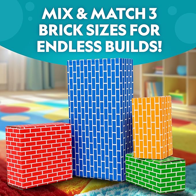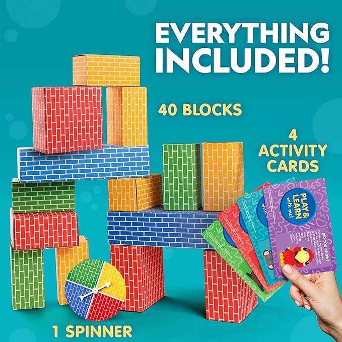 National Geographic Kids Jumbo Cardboard Building Blocks – 40 Heavy-Duty Bricks in 3 Sizes, Build & Learn with Game Spinner & Activity Cards for Kids 3+, Indoor Play Construction Toy for STEM Learning