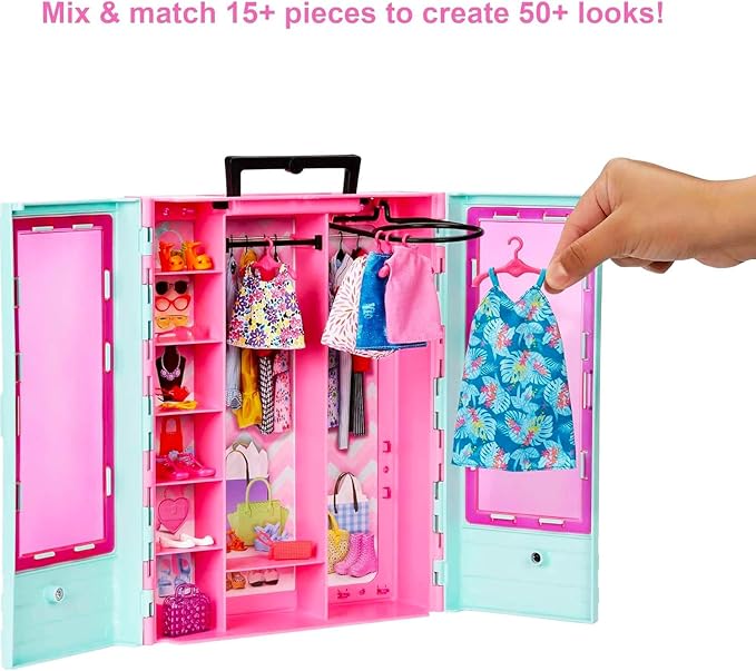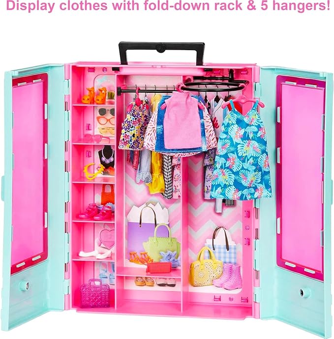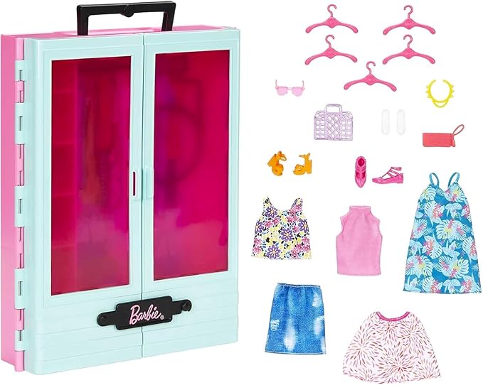 Barbie Closet Playset and Doll - Bundle with Closet, 3 Outfits, 2 Pairs of Shoes, 2 Purses, Necklaces, Beach Doll, Stickers, More | Barbie Dress Up Accessories Set for Girls