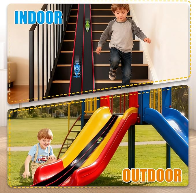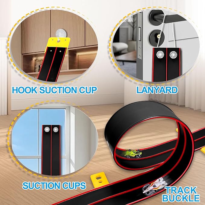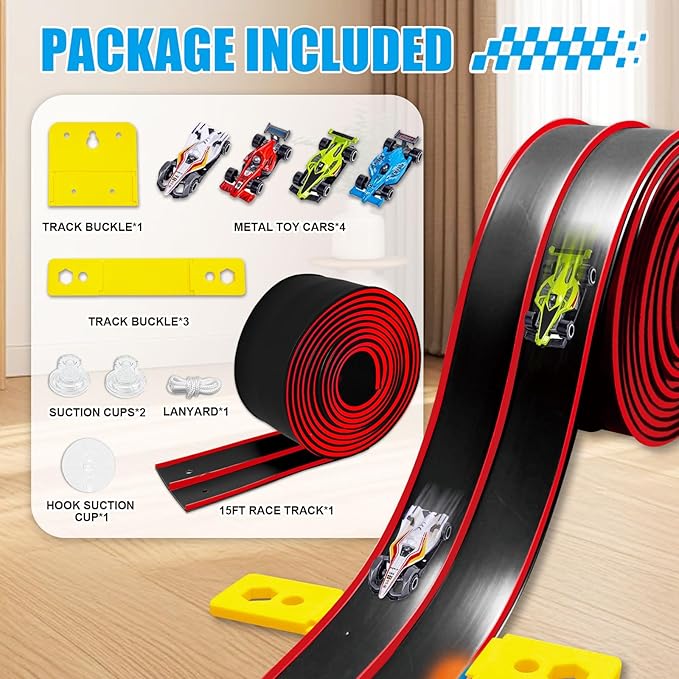 Flexible Race Track Toys for Kids 15 Ft with 4 Cars & Suction Cups, Portable Double Lane Racetrack Compatible with Hot Wheels & 1/64 Diecast Cars, Fun Car Ramp Track Set for Ages 3+(Black & Red)