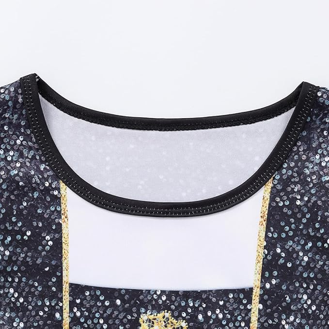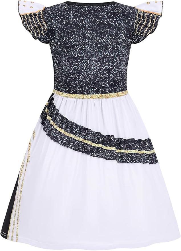 • Detailed Pop Star Design - The top of the dress features a stunning print that mimics a black sequin jacket adorned with gold chains, layered over a white top with a cool cross-strap and star emblem. Ruffled cap sleeves complete the stylish look